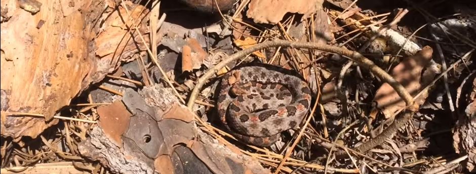This one is also widespread throughout the state and is grave venomous. It’s also known as canebrake rattlesnake. The adults can reach five feet or more. It has a colour pattern that helps it camouflage with soil, leave debris and rocks, its perfect habitat. It has large fangs which yield a lot of venom. Fortunately, the snake only strikes when cornered.